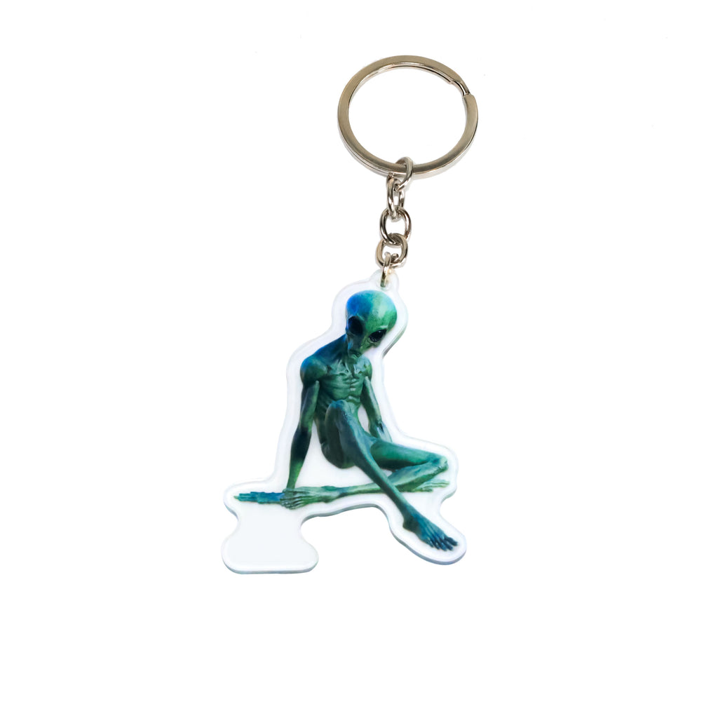 The sitting green Alien keychain represents a relaxed extraterrestrial taking a cosmic break